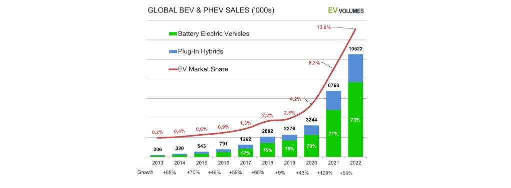 Svetovna prodaja električnih vozil (EV) se je v letu 2022 znatno povečala. Glede na zbirko podatkov o prodaji EV Volumes se je prodaja EV v letu 2022 povečala za 55 % in dosegla skupno 10,5 milijona. Te številke vključujejo baterijska električna vozila (BEV) in priključne hibride (PHEV). Kljub temu se regionalni vzorec rasti spreminja. Po 2 letih strmega povečanja prodaje v Evropi so električna vozila tam pridobila le +15 % v letu 2021.